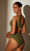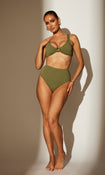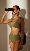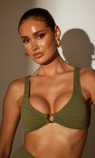 The ‘binos’ bikini top with ring detail in khaki zebra blends bold zebra print with textured crinkle fabric and chic ring detailing, offering a stylish and eye-catching look for your next beach day.