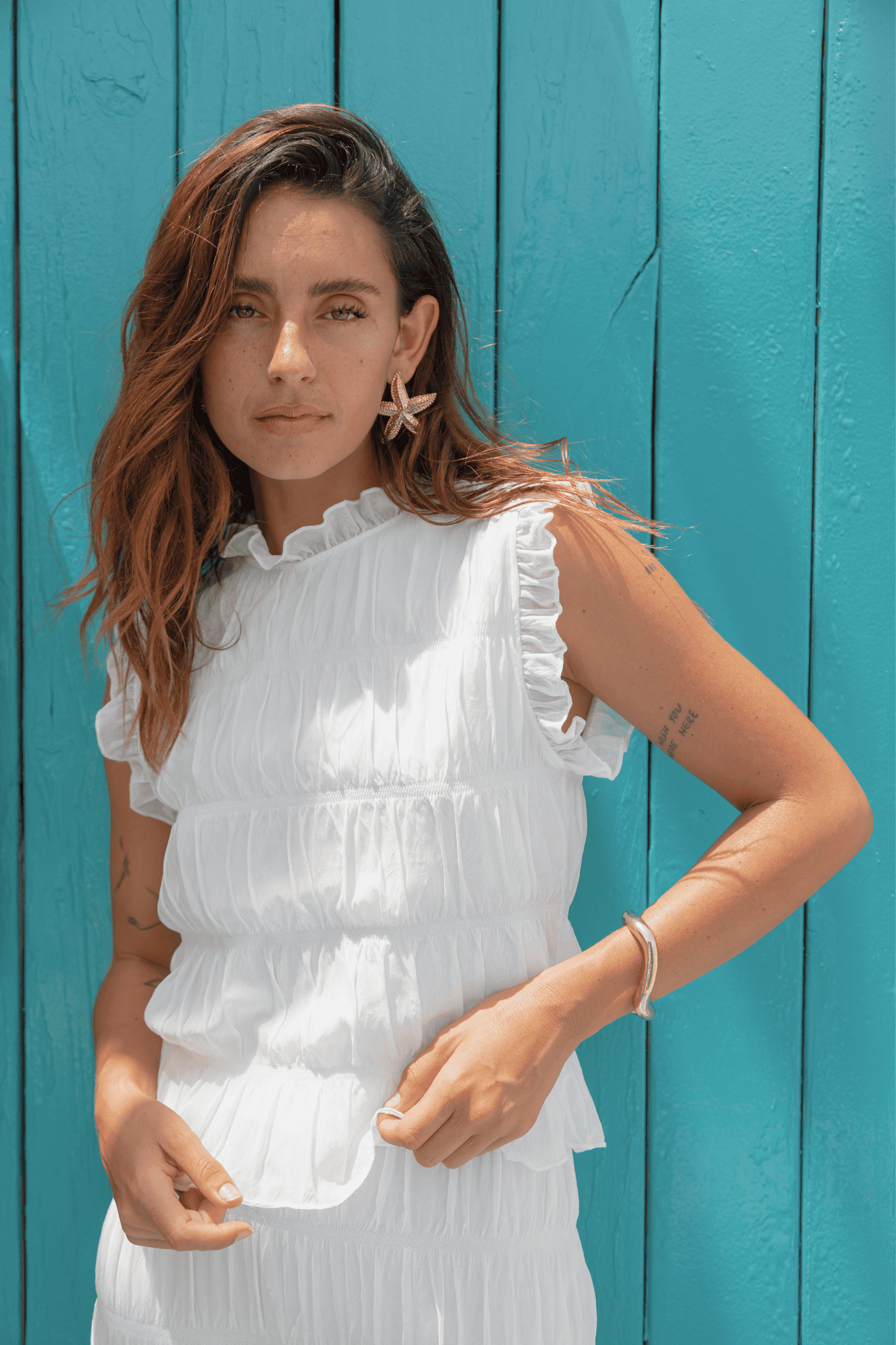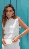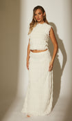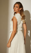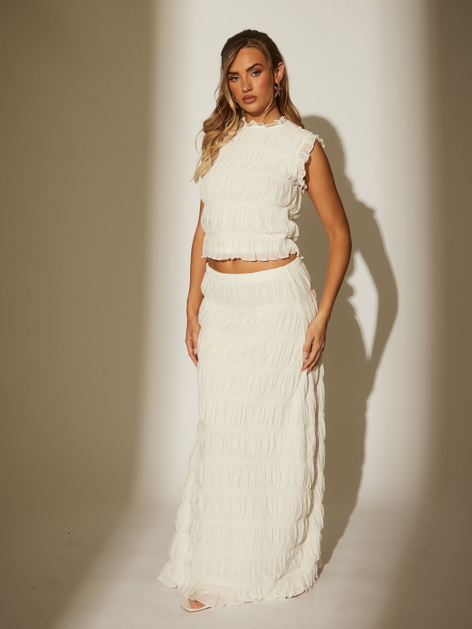 Our ‘tousel’ ruched frill crop top in white, also has a matching skirt - making the perfect timeless summer coord.
