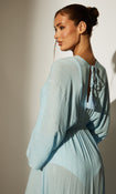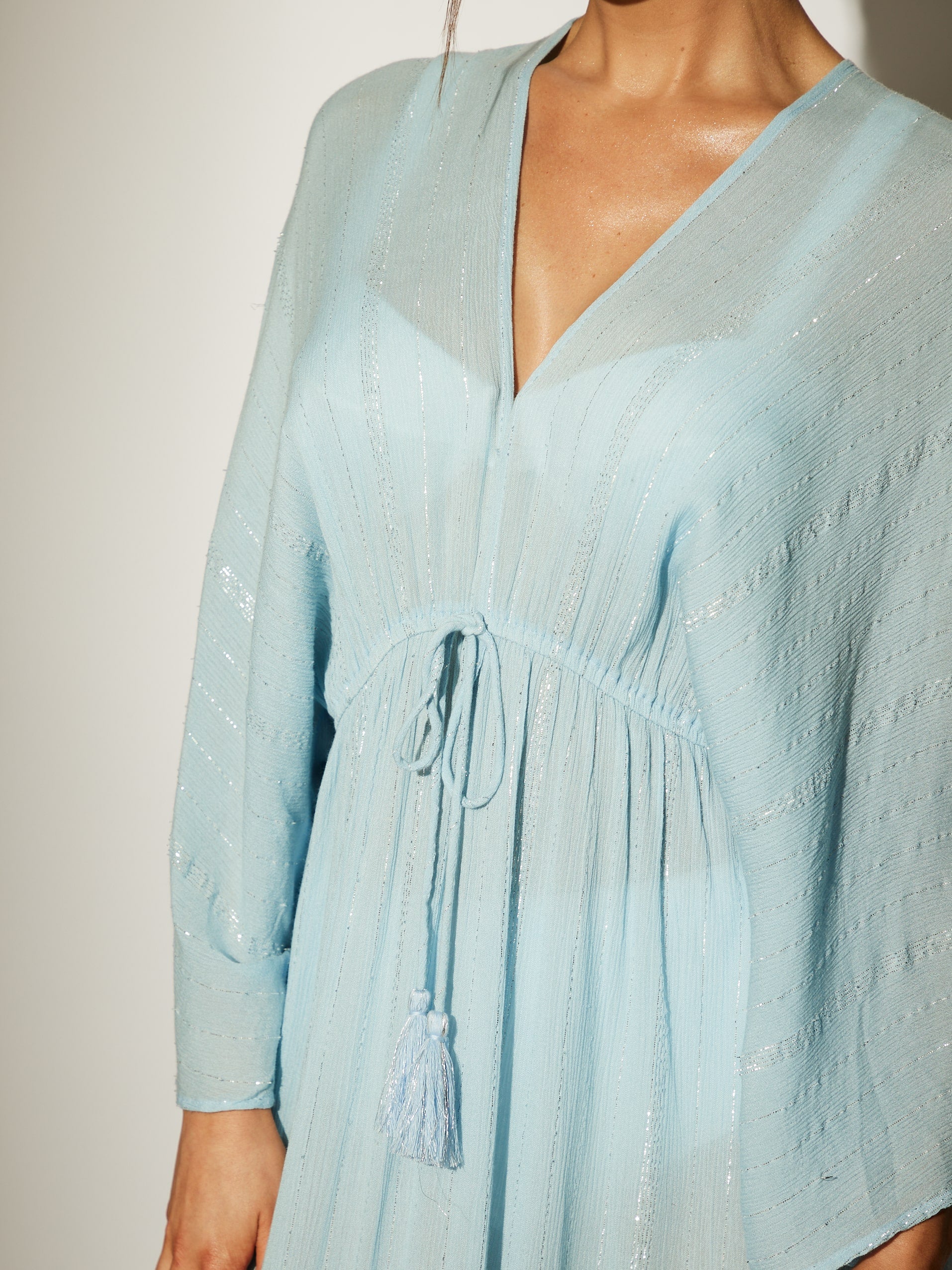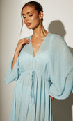 The Metallic Kimono Sleeve Beach Maxi Dress combines a shimmering metallic fabric with relaxed kimono sleeves for an effortlessly chic look.