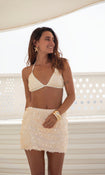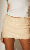 Shimmer and shine in our 'Adorn' sequin mini skirt in cream! This versatile stunner pairs perfectly with its matching bikini for beach-to-bar vibes, or team it with the coordinating jacket for a head-turning evening ensemble. Dress it down with a casual tee or elevate your look for night-out glamour. Your new go-to piece for adding a sprinkle of sparkle to any occasion!