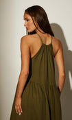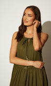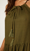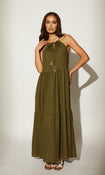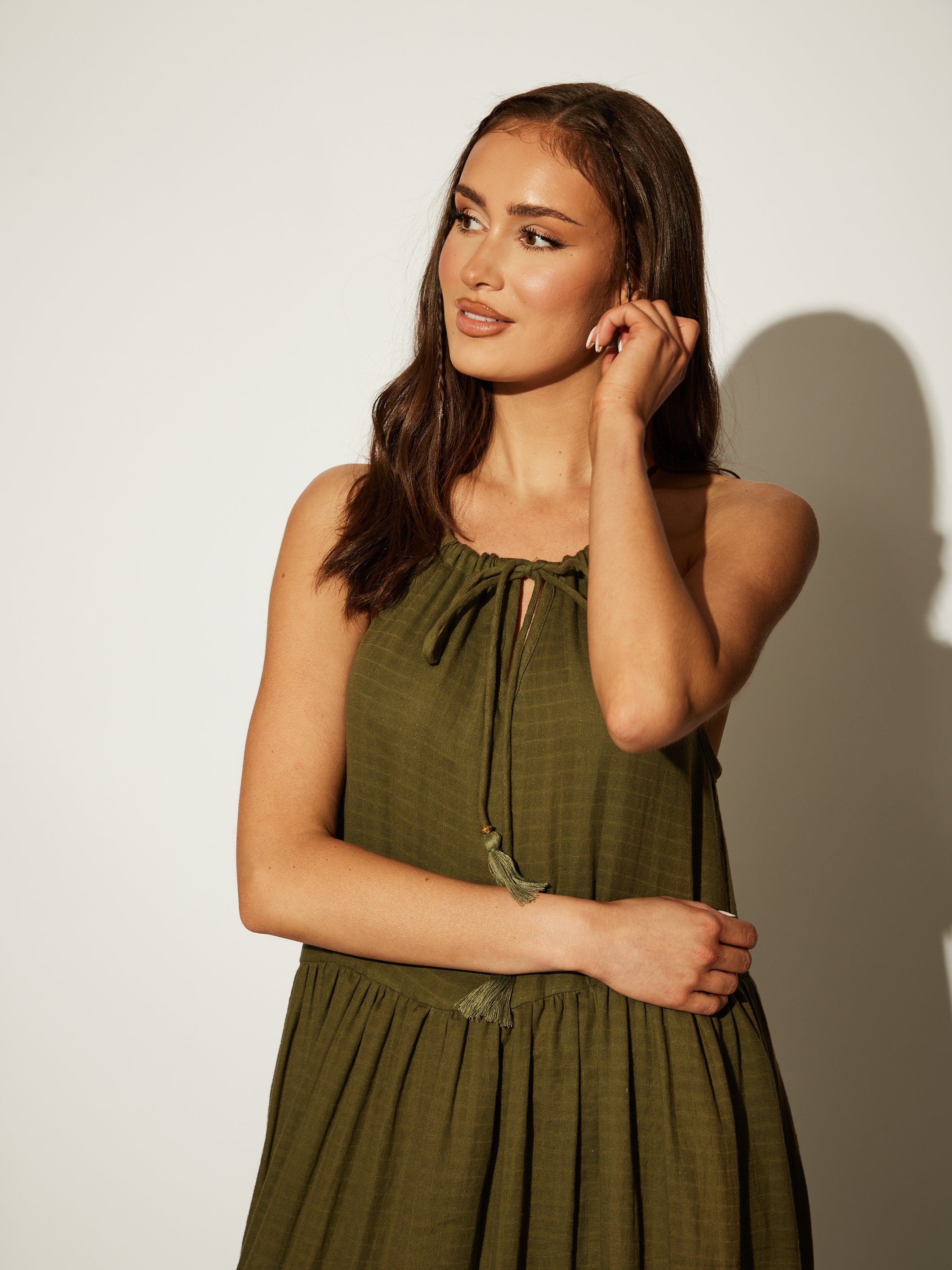 The Green Tie Front Textured maxi Dress, made from soft cotton, features a flattering tie-front design and a textured fabric, offering both comfort and style for casual or semi-formal outings.