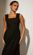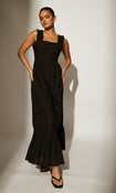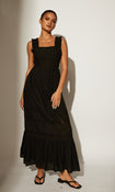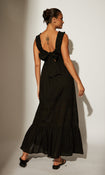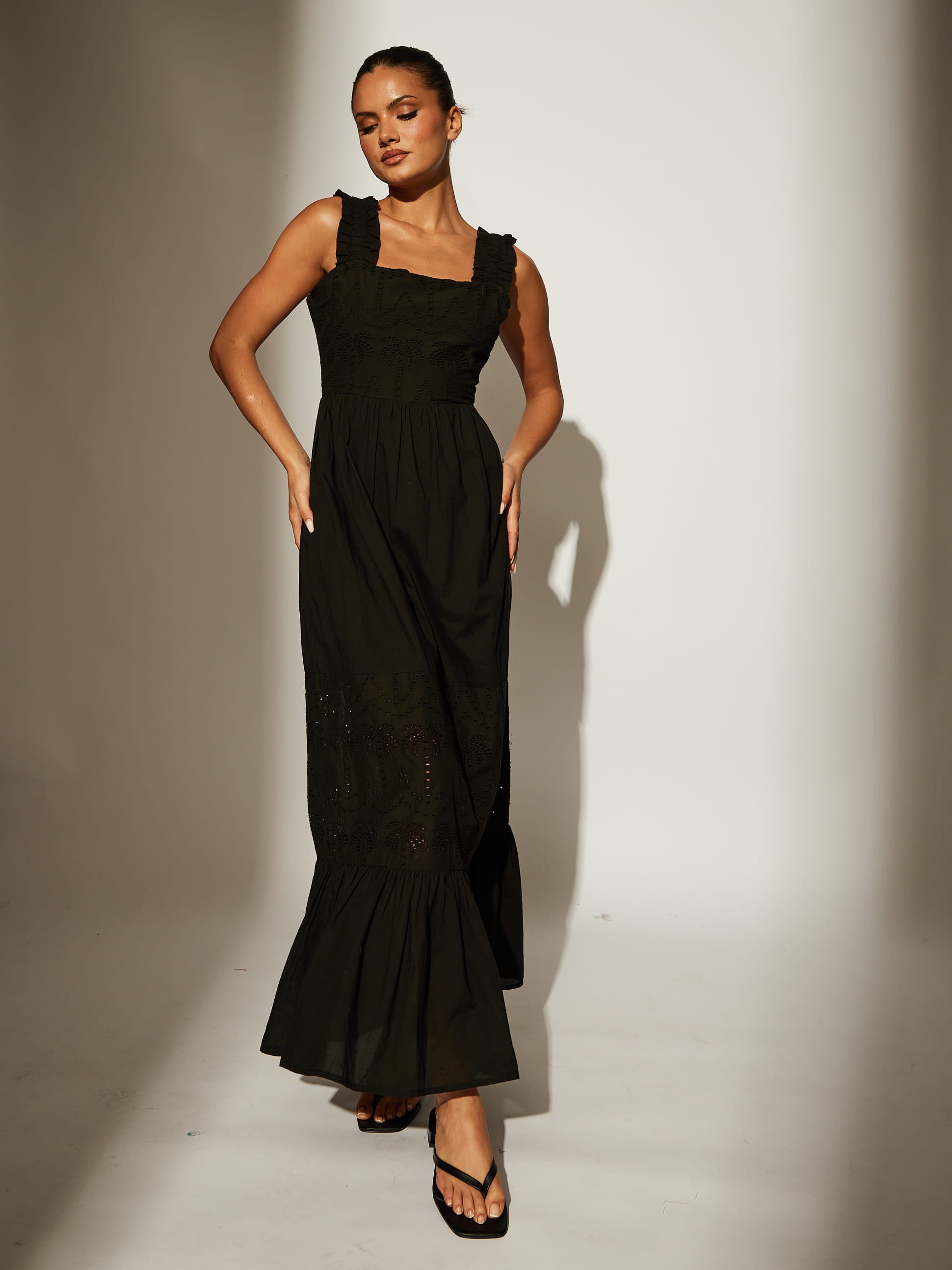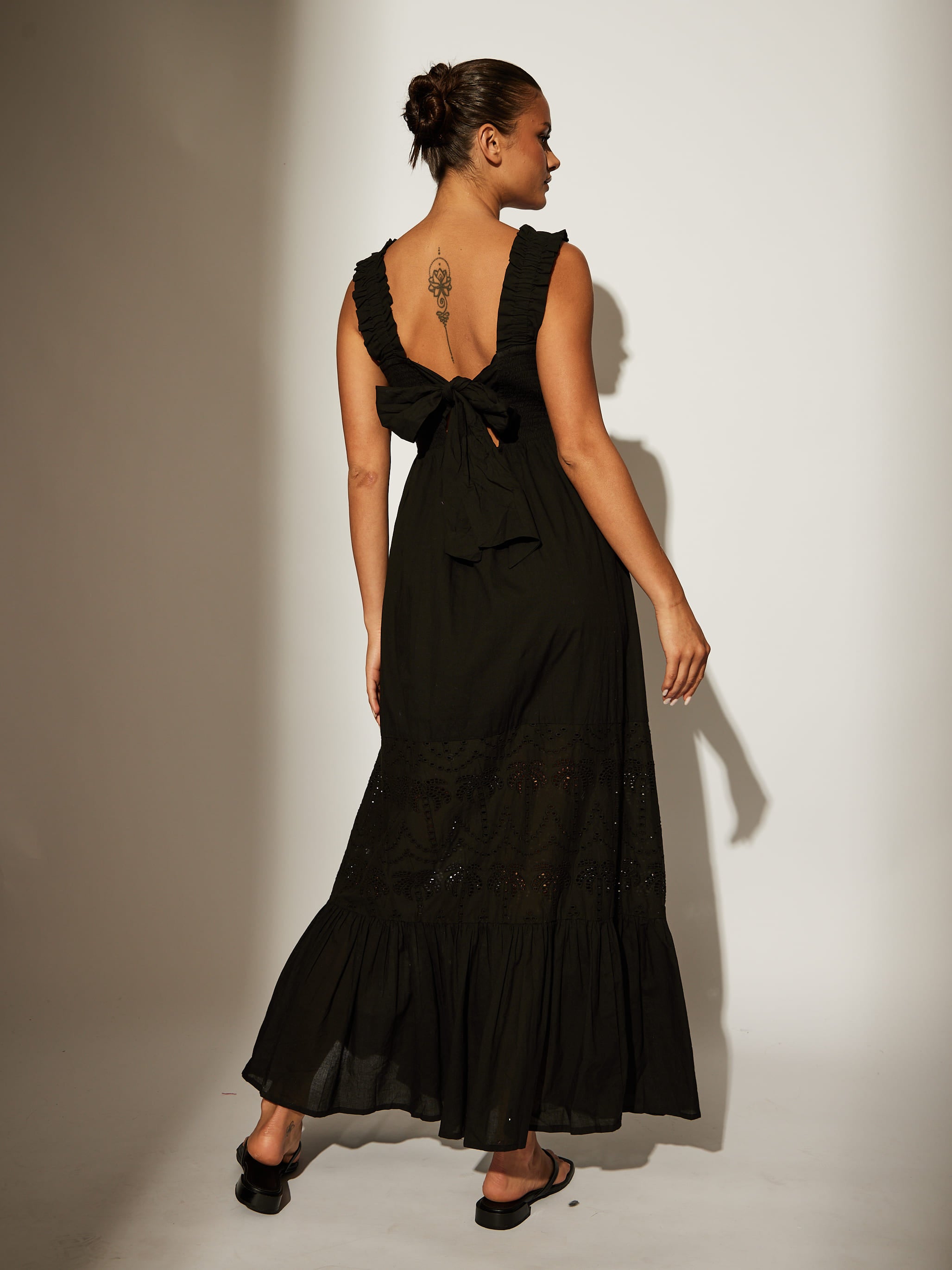 The Palm Broderie Tie Back Maxi Dress features intricate broderie detailing and a flattering tie-back design.