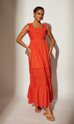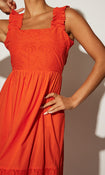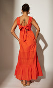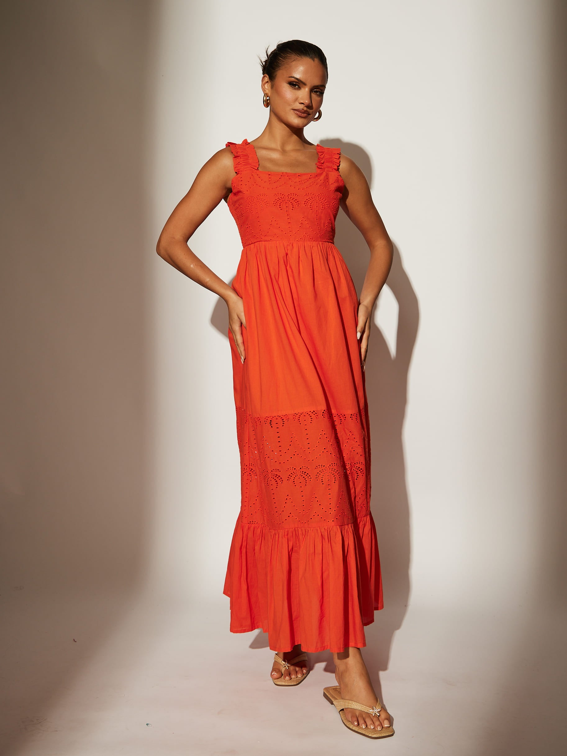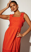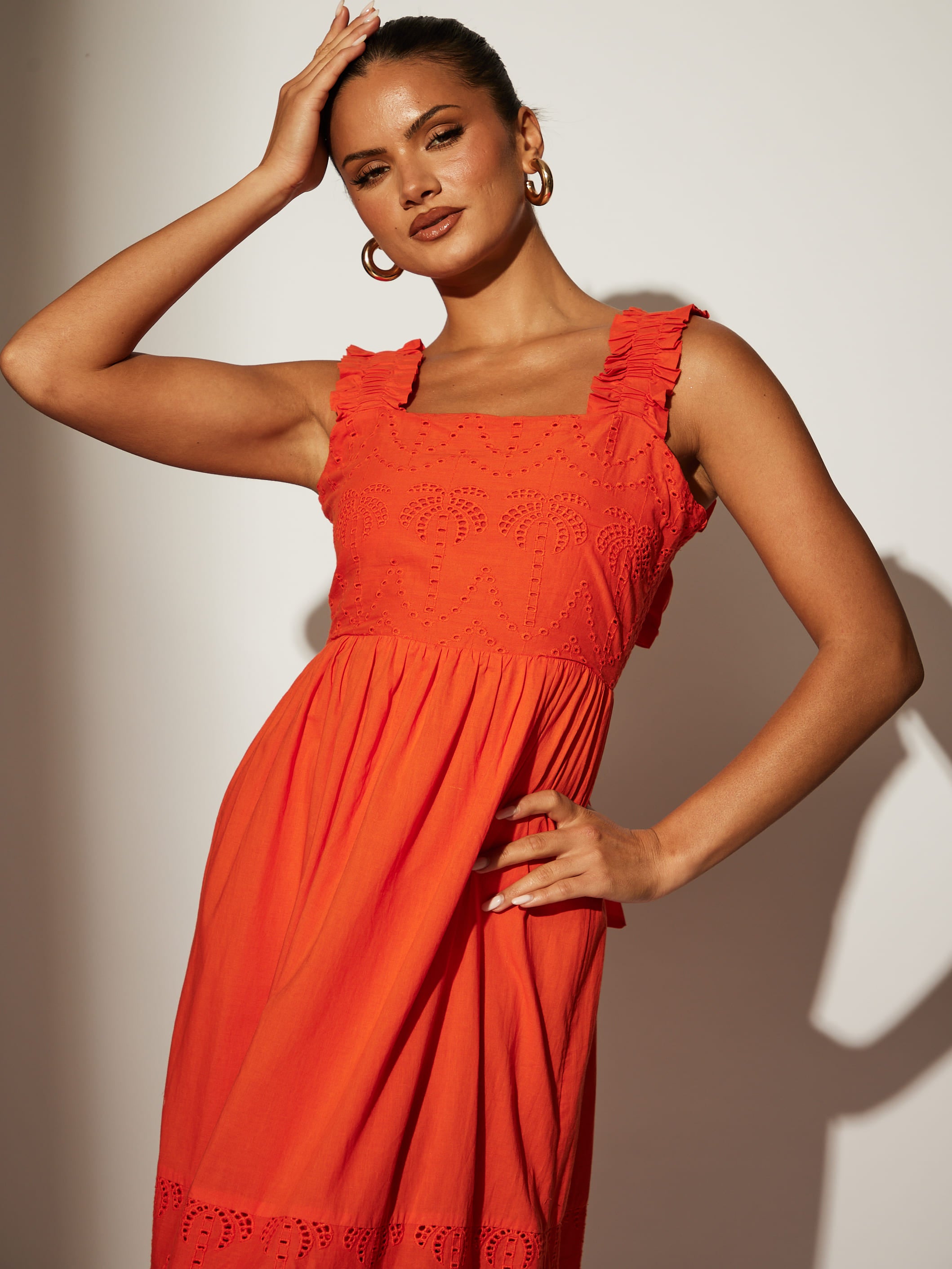 The Palm Broderie Tie Back Maxi Dress features intricate broderie detailing and a flattering tie-back design. With a flowy maxi length and tropical palm motif, it's the perfect dress for a relaxed, breezy look. The bright tangerine is perfect for summer days and nights,