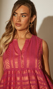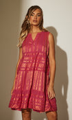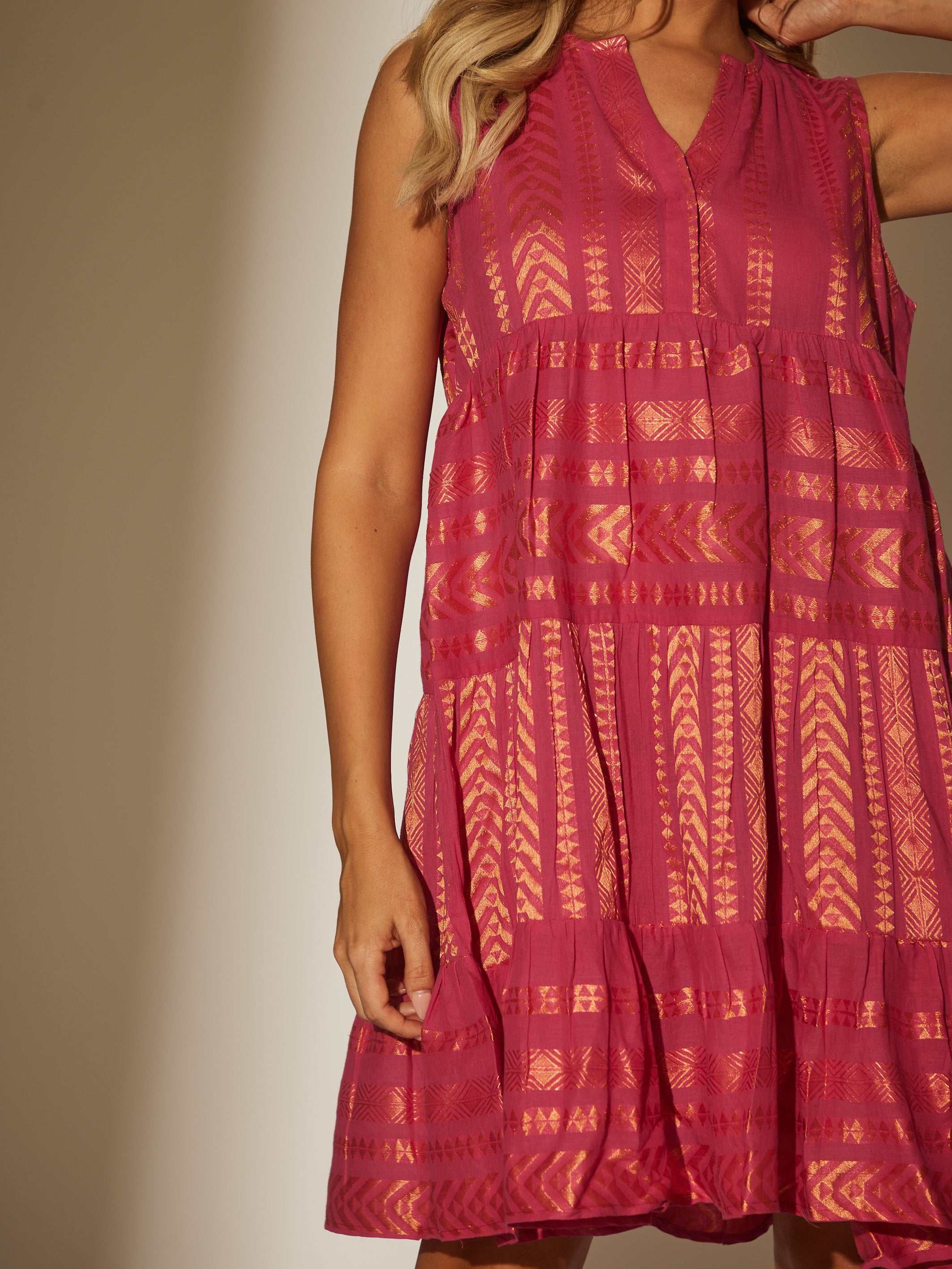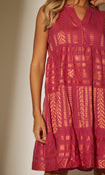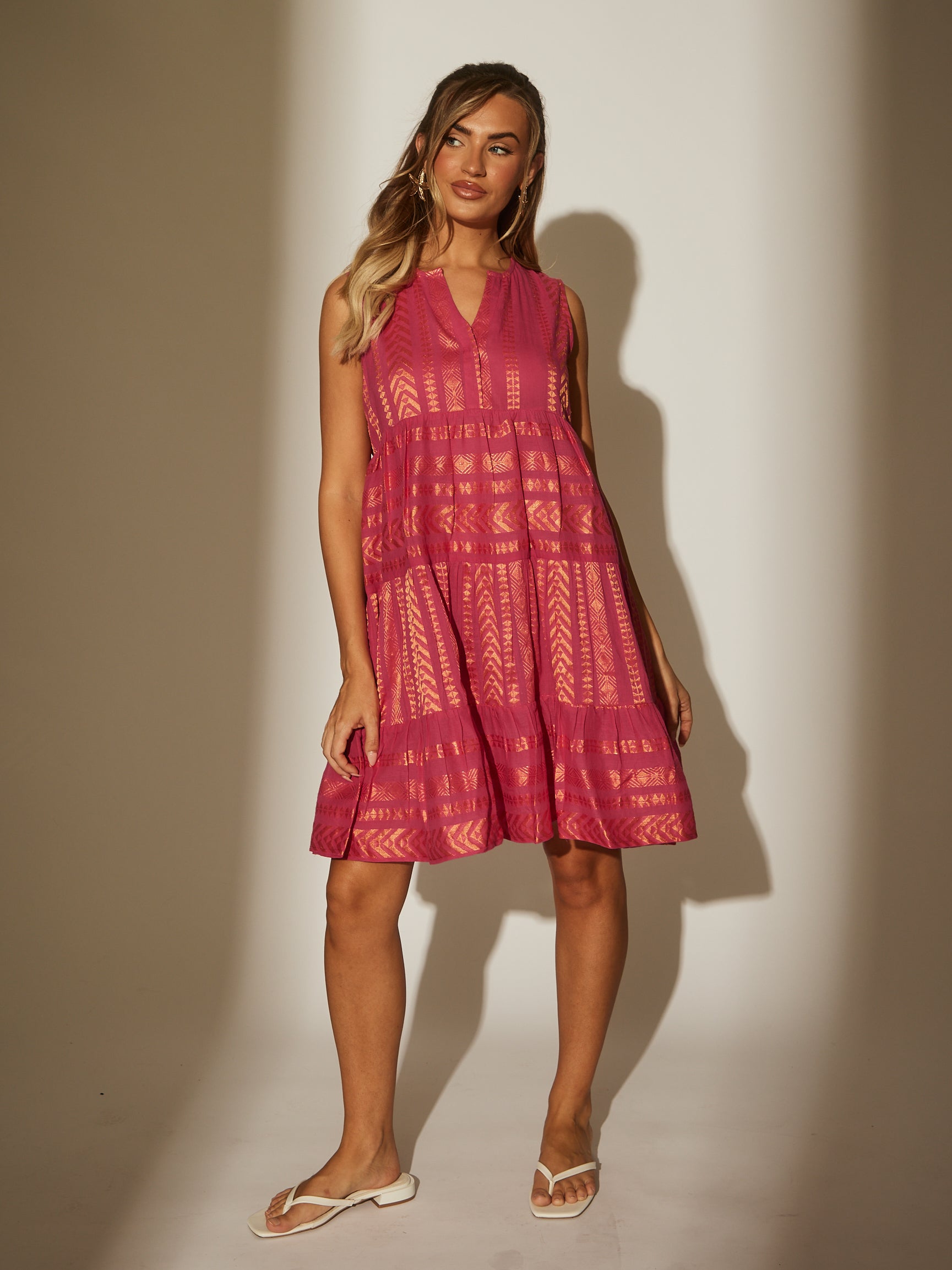 Shine in the Metallic Jacquard Sleeveless Tiered Knee-Length Dress.