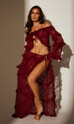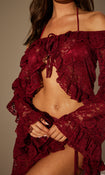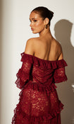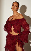 Embrace romantic style with the ‘palmas’ bardot lace top in cherry. This feminine piece features delicate lace detailing and ruffles along the neckline, creating an effortlessly elegant look perfect for any beach club or summer evening event.