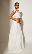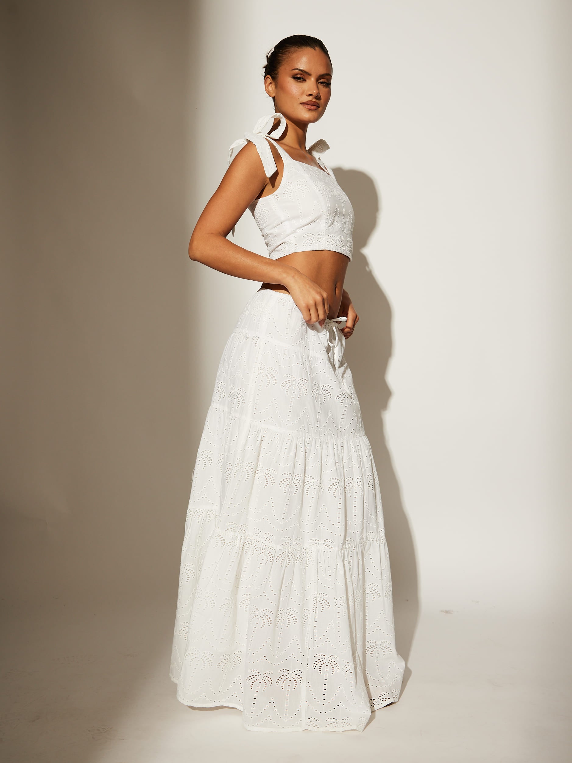 The tie shoulder straps allow for a customisable fit, offering both comfort and style. Light and breathable, this top pairs beautifully with the matching broderie midi skirt, making it a versatile and stylish addition to your summer wardrobe. Versatile piece perfect for casual outings or beach-to-bar styling.