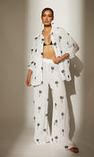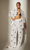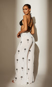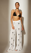 The Embroidered Transparent Beach Pant with Embroidered Sequin Palm Tree Details offers a perfect mix of comfort and tropical elegance.