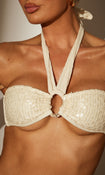 The 'sorbet’ halter bikini top in vanilla sequin features intricate crochet detailing and sparkling sequins, with a flattering halter neck design and a stylish ring accent for a chic, beach-ready look.