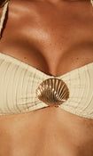 Elevate your swim collection with the ‘serene’ bikini top in vanilla rib. The elegant pleating and statement shell decal add luxurious detail, while the textured fabric creates plush elegance.