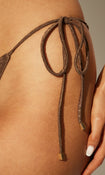 Tanga bottom with a dipped front and cheeky back coverage. Ties at the hips to allow for the perfect fit. Fully lined and ties finished with gold decals.