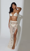 Woman in a starfish cream bikini and crochet skirt standing on a beach with ocean waves in the background