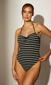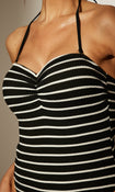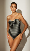 Experience ultimate comfort and style with our striped crinkle ruched bandeau swimsuit.