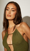 Featuring front cut out detailing, central gold bar decal, plunge V neckline and halter tie neck, so you can adjust for your perfect fit!