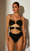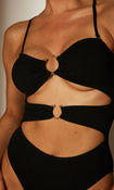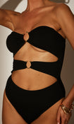 Our VIVACIOUS swimsuit in BLACK CRINKLE is simply made to be in the sunshine! With a gorgeous cut out and ring detailing, you'll be catching eyes as well as rays. Designed to accentuate all the right places, this swimsuit is a must have in your holiday wardrobe. Straps can be worn down so it becomes strapless.