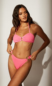 The Crinkle Ring Side Bikini Brief in Hot Pink features textured fabric and bold ring side details, offering a vibrant and flattering fit for a stand-out beach look.