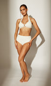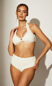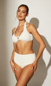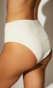 The White Textured Crinkle High Waist Bikini Brief Bottoms offer a flattering high-waisted fit with crinkle fabric, combining comfort and style for a chic beach-ready look.