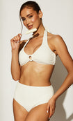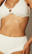 The White Textured Ring Bikini Top features a chic textured fabric with a stylish ring detail at the centre, offering a flattering and supportive fit for your beachside look.