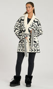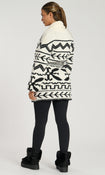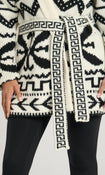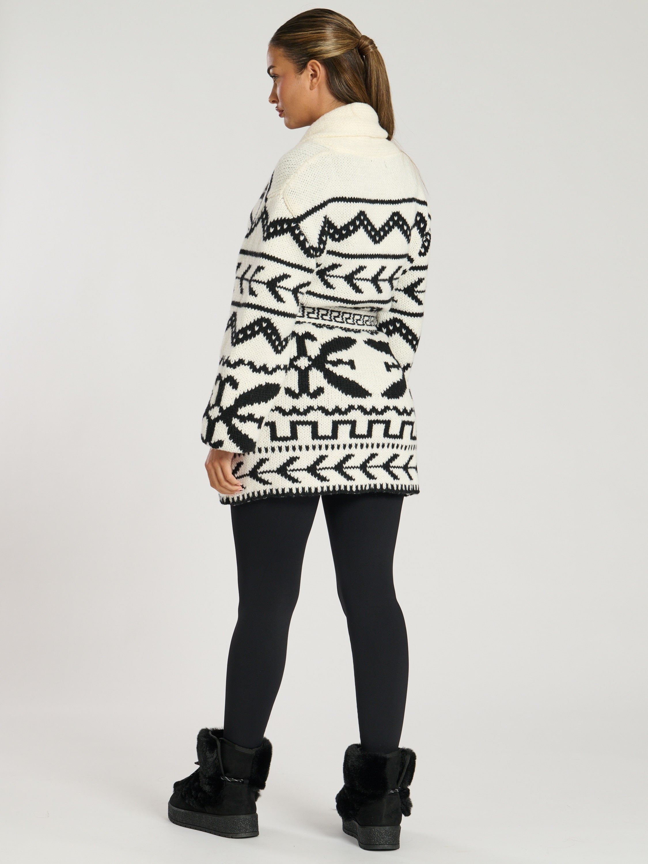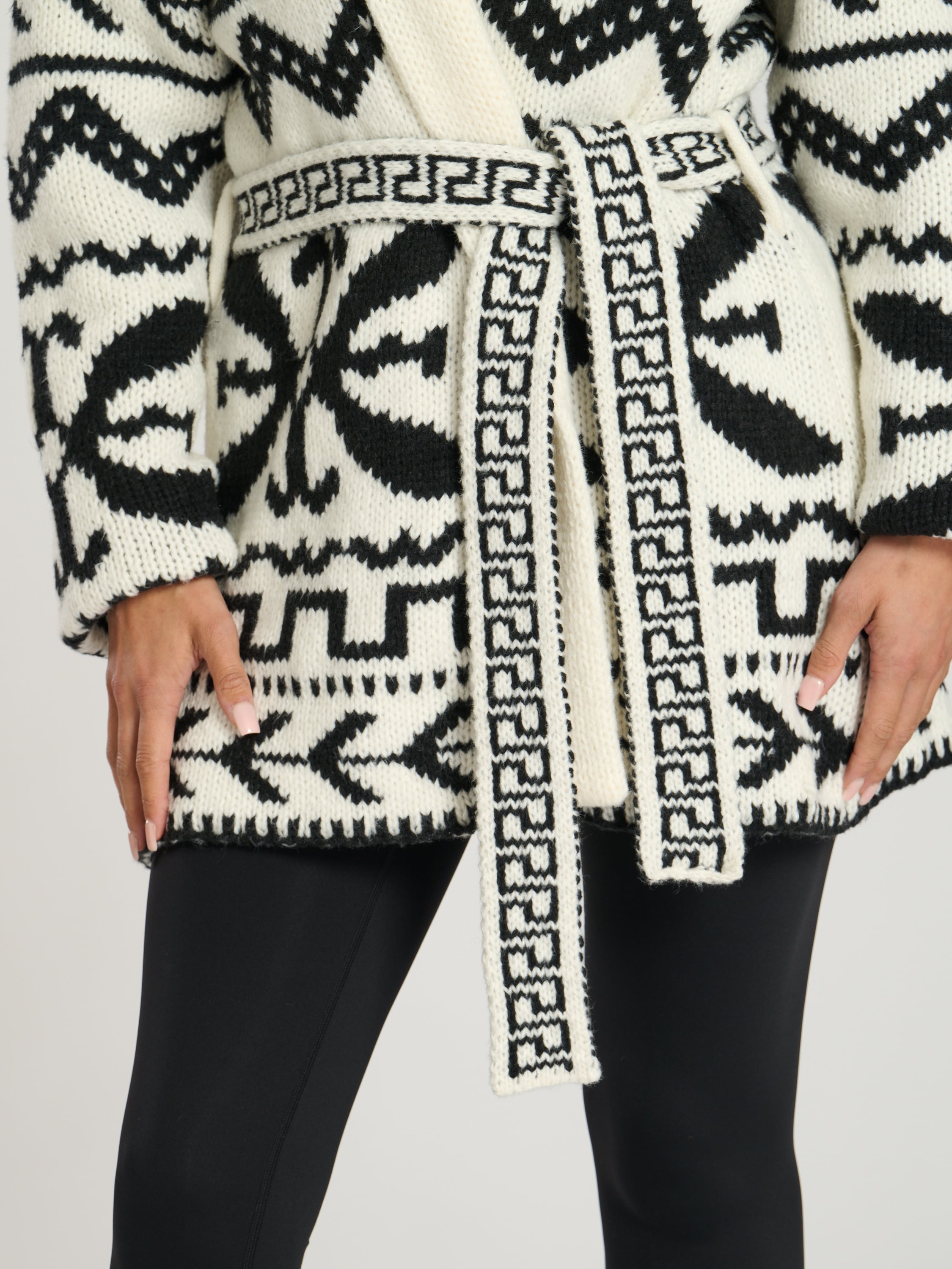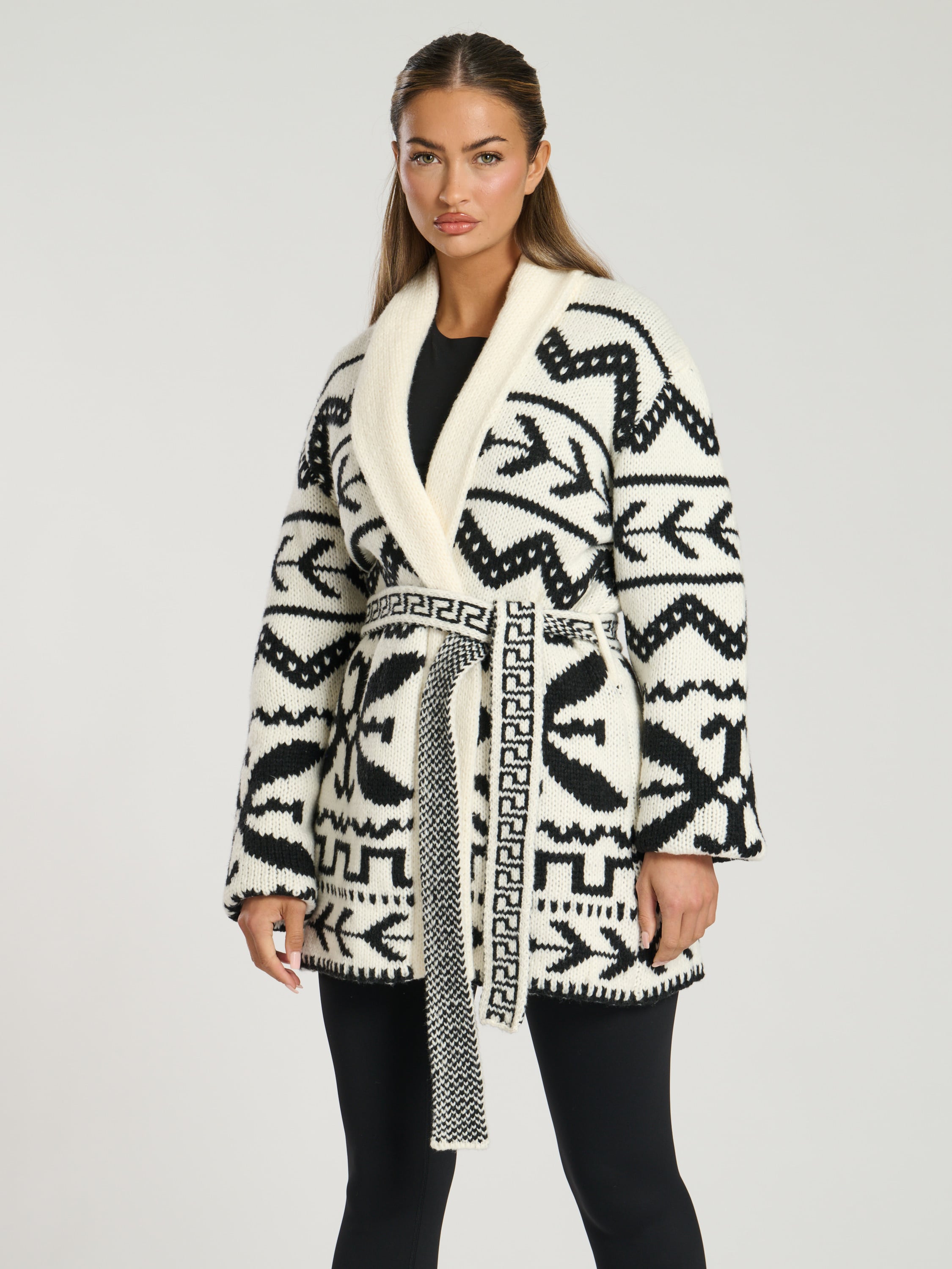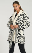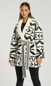 Embrace bohemian chic with our HYGGE AZTEC TIE WAIST CARDIGAN IN MONOCHROME. This eye-catching piece combines comfort and style for a unique addition to your wardrobe.