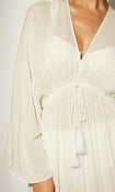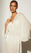 The Metallic Kimono Sleeve Beach Maxi Dress combines a shimmering metallic fabric with relaxed kimono sleeves for an effortlessly chic look.