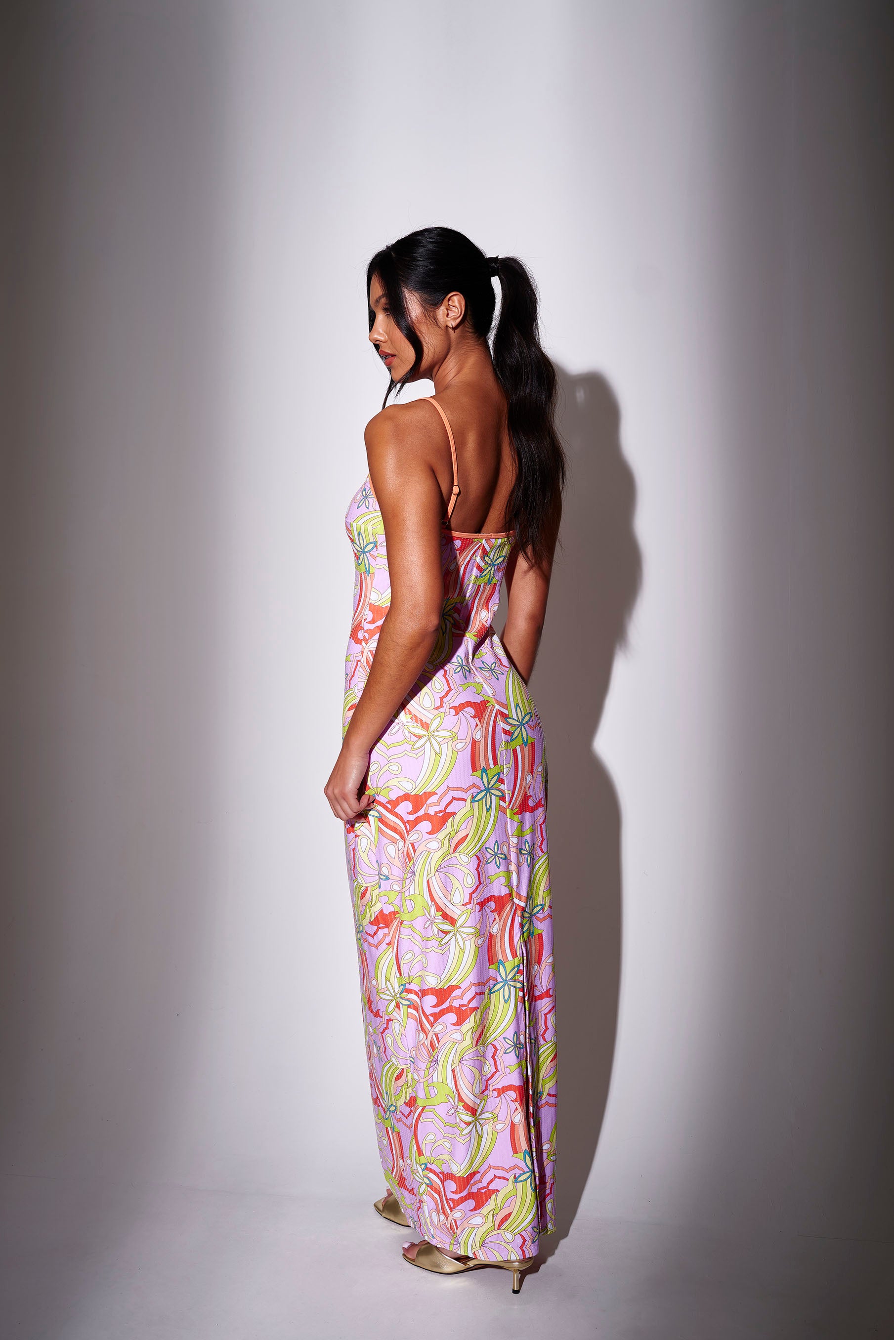 Retro meets sequin sparkle in this statement maxi dress.